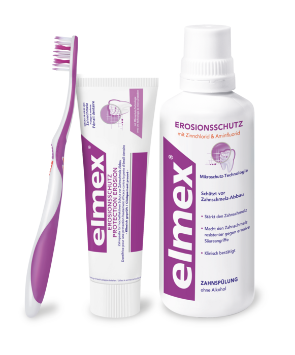 Zusätzlich und als Ergänzung empfehlen wir 1x täglich die elmex® EROSIONSSCHUTZ Zahnspülung.