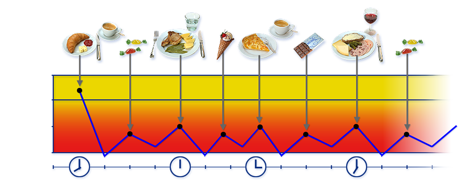 Zwischenmahlzeiten senken den pH-Wert in den kariesverursachenden sauren Bereich.