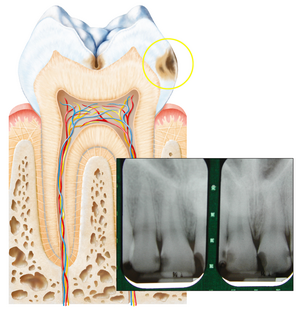 Löcher entstehen oft zwischen den Zähnen. Deshalb sind sie nur auf dem Röntgenbild zu erkennen.