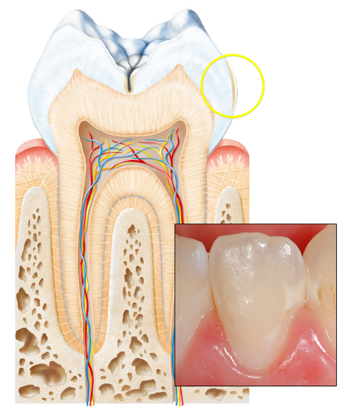 Die Aminfluoride in den elmex® Produkten remineralisieren den Zahn. Ein Loch kann jetzt noch verhindert werden.