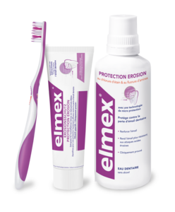 Nous recommandons d'utiliser en complément 1x par jour l'eau dentaire elmex® PROTECTION EROSION.