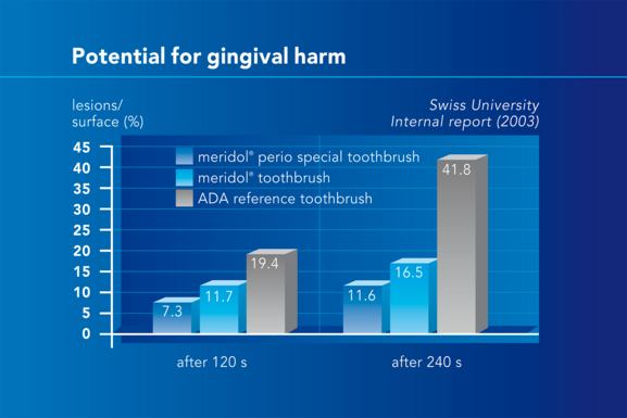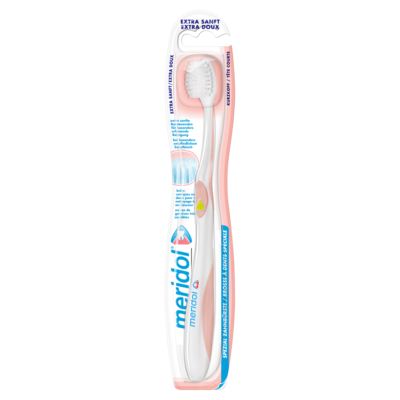 Die meridol® Spezial-Zahnbürste aus der meridol® Forschung wurde für die kurzfristige Anwendung bei besonders empfindlichem und irritiertem Zahnfleisch entwickelt. Die sich ansammelnde Plaque wird sehr gründlich und schonend entfernt. Der kleine Bürstenkopf erreicht mühelos alle Zahnflächen. Der ergonomisch geformte Griff ermöglicht eine optimale Führung der Zahnbürste.
